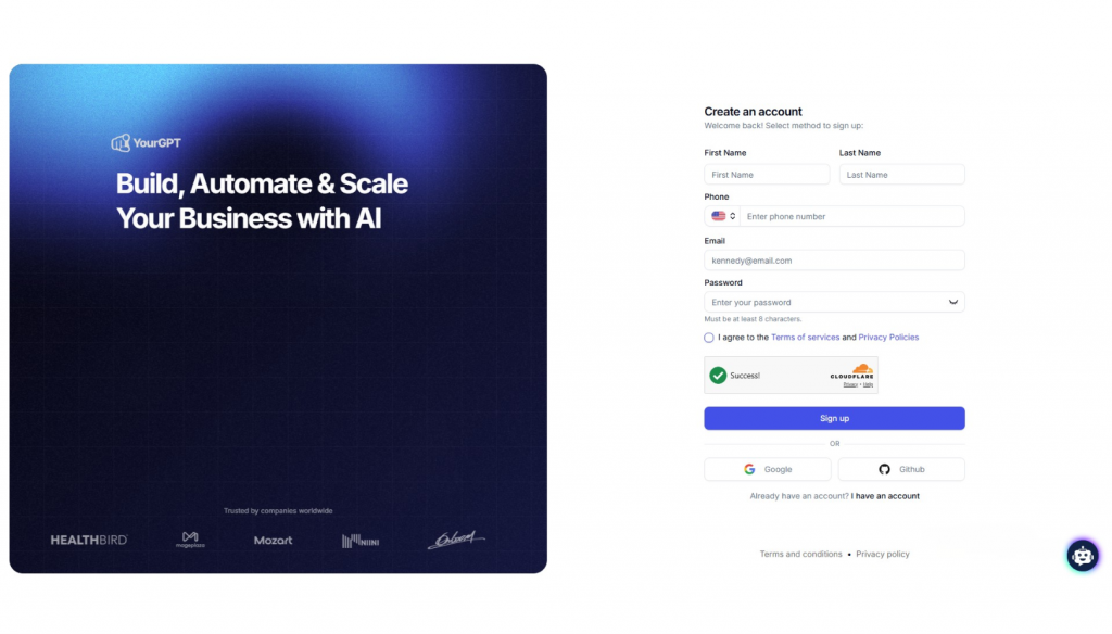 Sign up at yourgpt.ai. No credit card required. You will be inside the dashboard in under a minute.