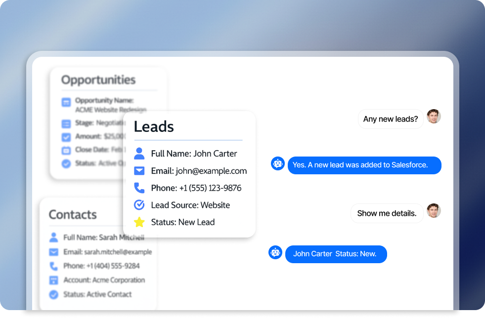 Create or update leads, contacts, cases, or opportunities directly from conversations, with full support for required fields and validation rules.